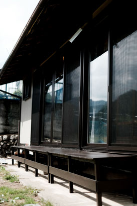 室内は土足厳禁です。玄関から靴を脱いで上がってください。庭は広く夏ミカンや柿、キンモクセイやカエデの木が植わっており、広い窓を開けて縁側に座ると、南側に御岳山の稜線を望むことができます。